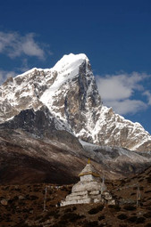 The impressive form of Ama Dablam dominates the horizon to the right, with its two snow-covered ridges reaching out either side of its steep domed summit.